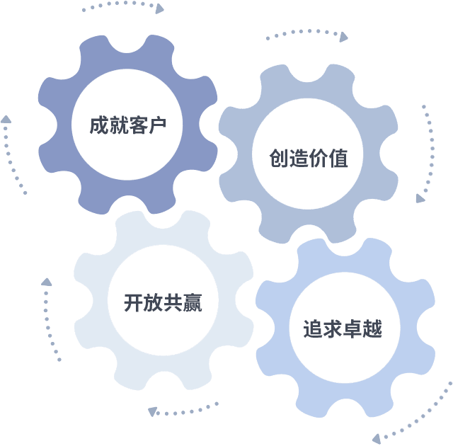 成就客户是一切决策的出发点,,创造价值是衡量所有工作的标准,,,,追求卓越是我们做事做人的态度,,,开放共赢是我们的格局也是最终的结果。。。价值观的齿轮环环相扣,,推动着组织里的每个人不断向前。。。。