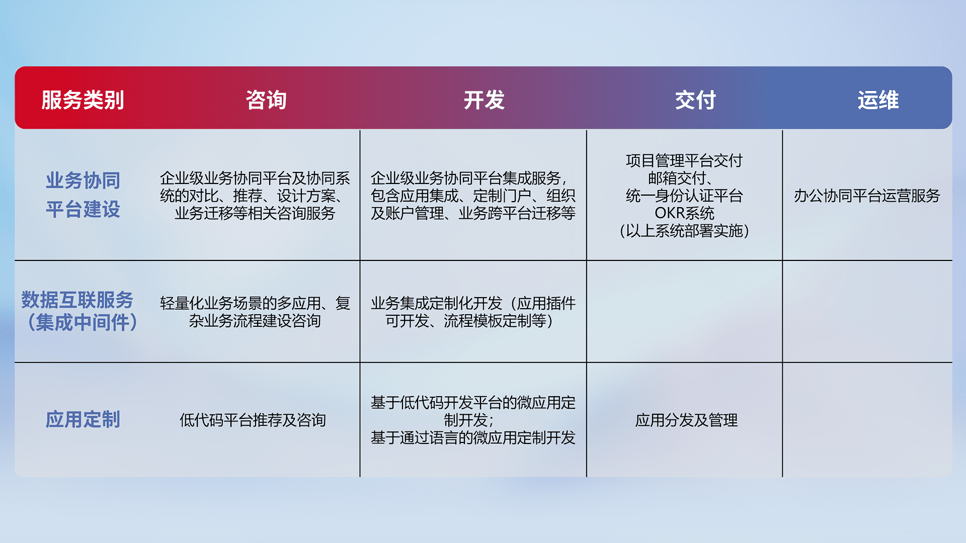 针对钉钉、、、、企微、、、IDaas等平台级产品提供产品的规划、、方案、、交付、、、定制化开发等服务,,,实现如统一协同办公、、、智能客户服务、、、、混合会议管理、、智能数据查询、、、等业务场景,,实现数字化转型。。。。